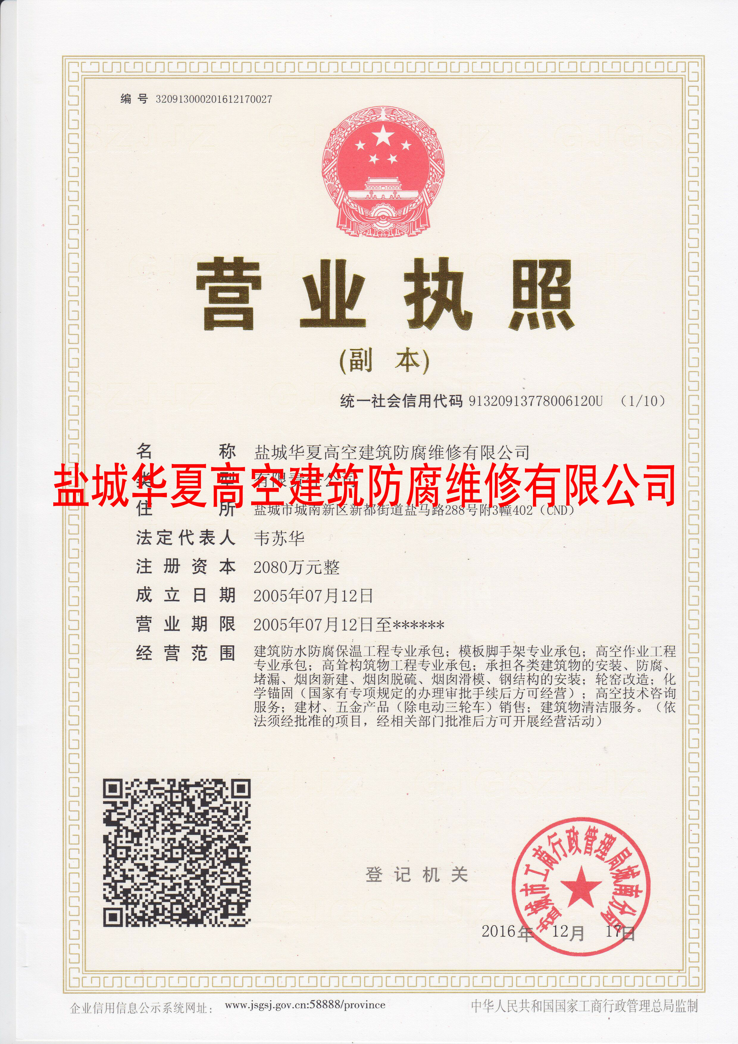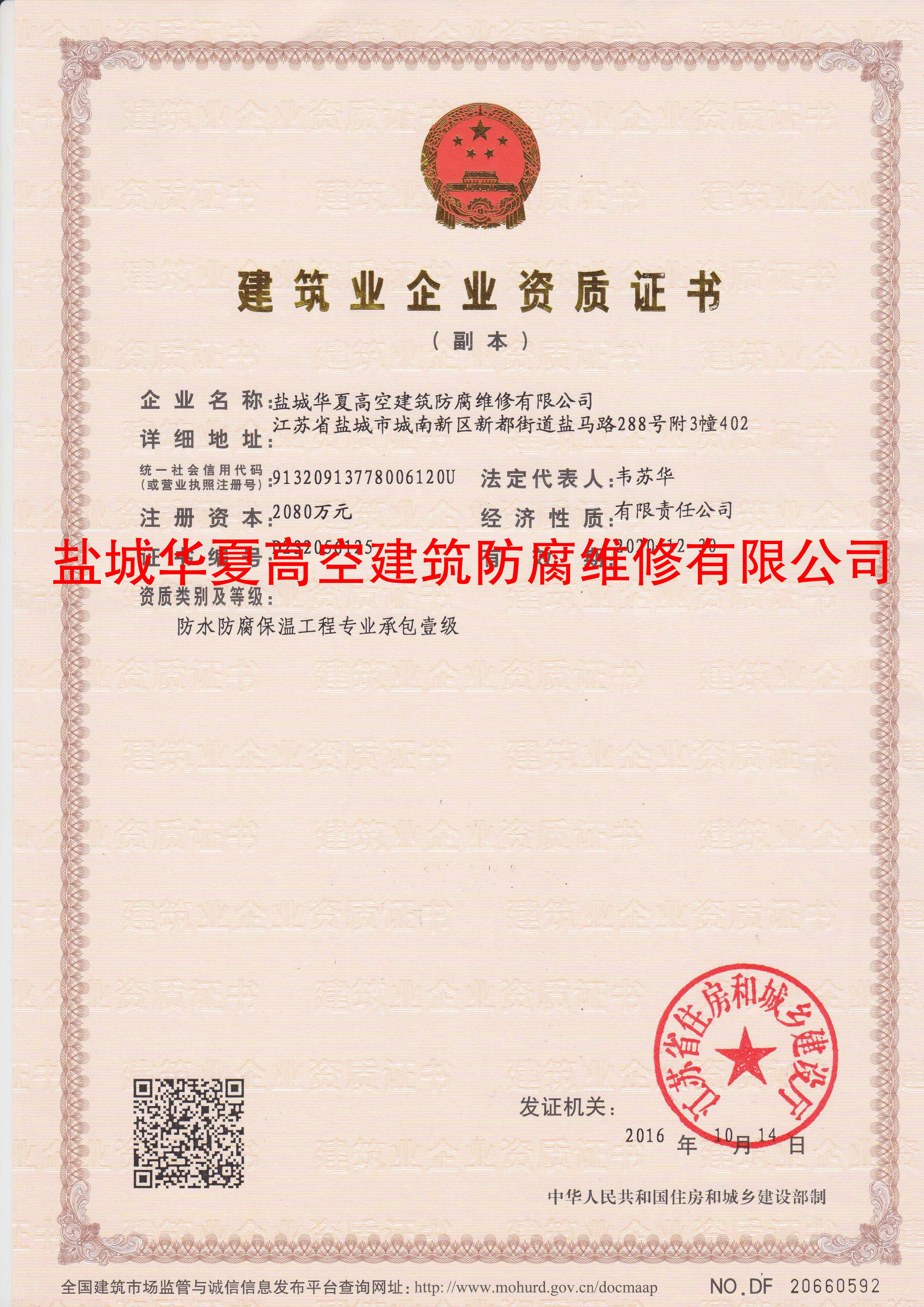 查看更多+ 鹽城華夏高空建筑防腐維修有限公司.具備化學堵漏施工資質的專業化公司。華夏公司三十多年來,專業致力于各類防水、堵漏技術的研究。采用國外 技術,使得防水、堵漏施工技術更加完善、更加 。公司擁有專業的工程技術人員、生產施工管理人員、施工隊伍和專業的施工設備。專業堵漏施工、治理各種建筑工程滲漏,管道泄漏。尤其對大體積砼裂縫、地下室、污水池、電纜溝、伸縮縫、施工縫、隧道、船塢等漏水有多年的成功處理經驗。服務承諾:"廉價優質、定期回訪、實行三包" 歡迎社會各界朋友為本公司提供寶貴建議!
